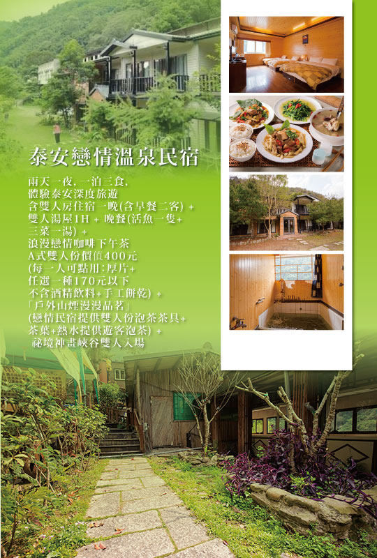 只要2980元,即可享有【泰安戀情溫泉民宿】兩天一夜,一泊三食,體驗泰安深度旅遊〈含雙人房住宿一晚(含早餐二客) + 雙人湯屋1H + 晚餐(活魚一隻+三菜一湯) + 浪漫戀情咖啡下午茶A式雙人份價值400元(每一人可點用:厚片+任選一種170元以下不含酒精飲料+手工餅乾) + 「戶外山煙漫漫品茗」(戀情民宿提供雙人份泡茶茶具+茶葉+熱水提供遊客泡茶) + 祕境神畫峽谷雙人入場〉5/31前入住可享平假日不加價